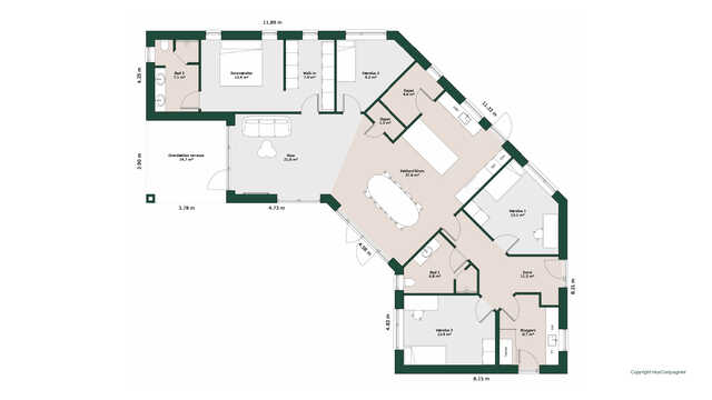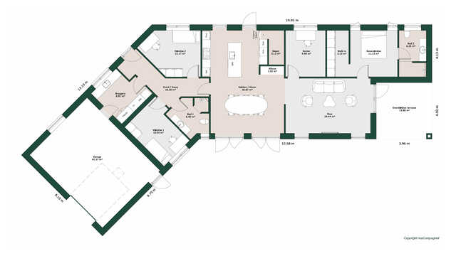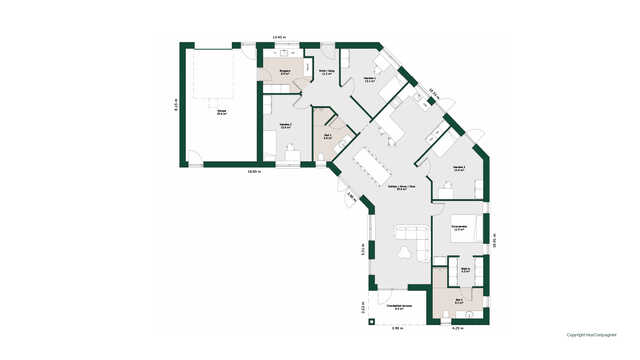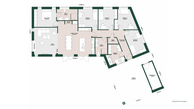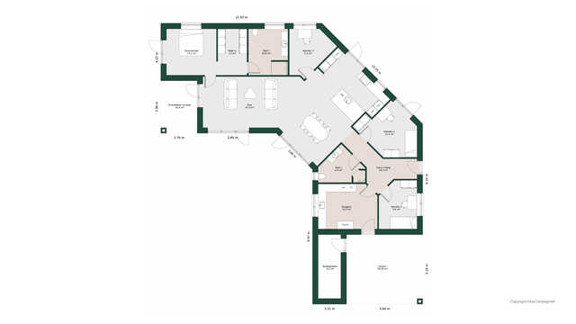Børneafdelingen byder på to gode værelser med udgang til have og eget bad samt kontor. Forældreafdelingen har stort soveværelse med garderobeområde og en stort badeværelse med badekar.