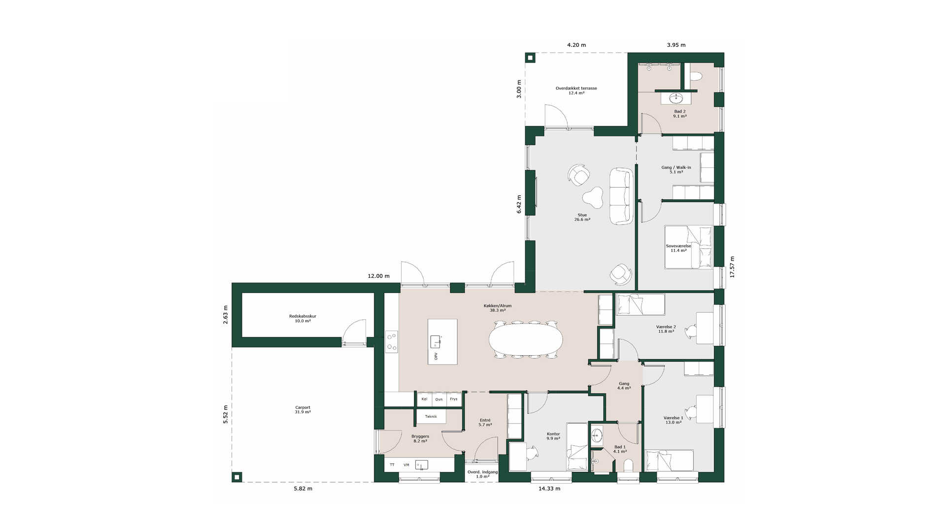 Her er praktisk indbygget opbevaring i de to store værelser, entréen, det store walk-in og masser af plads i det store køkken og bryggers.
