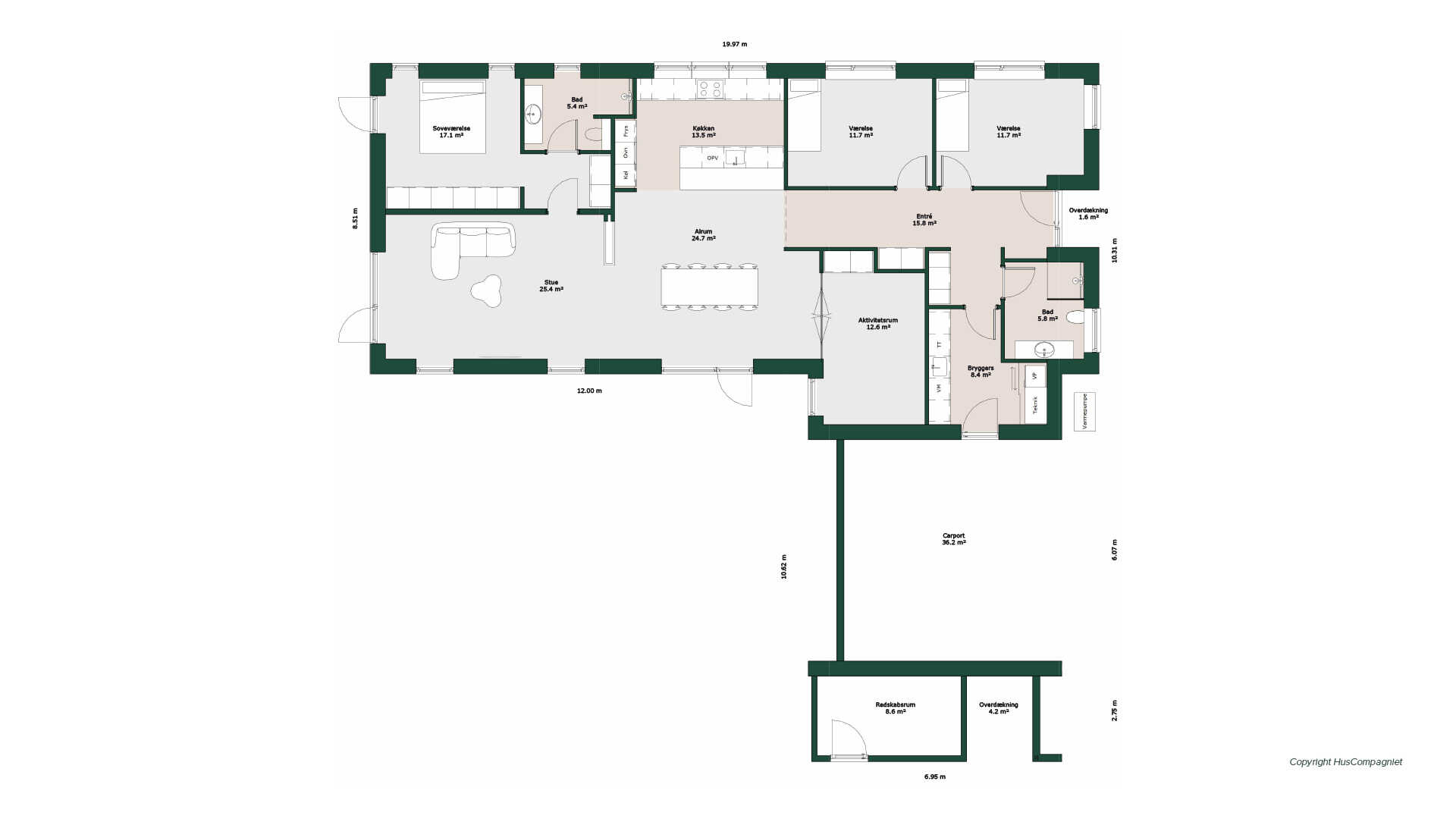 Når man træder indenfor i husets entré, bliver man mødt af et lang kik gennem hele huset. Entré/gang er fordelingsgang til 2 dejlige børneværelser og fra entreen er der ligeledes adgang til husets ene badeværelse samt bryggers. Entreen går direkte over i køkken/alrum hvor lysindfald fra to sider samt biopejsen skaber både hygge. I forbindelse med stuen ligger kontor/aktivitetsrum som afskærmes med NewYorker-parti.