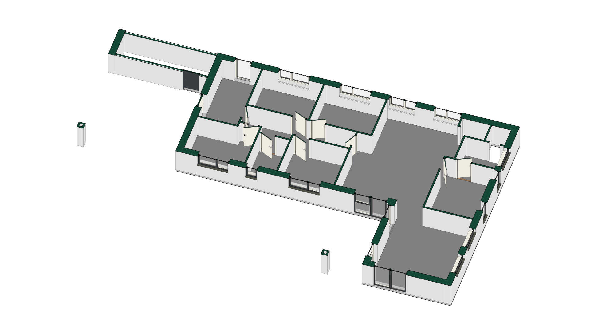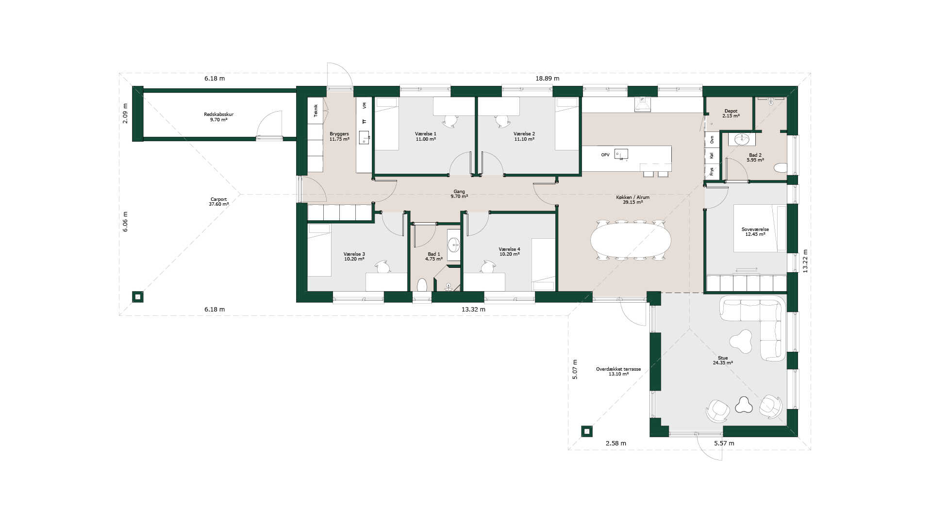 Planløsningen tilbyder indgang til huset gennem carporten. Herfra opnås nem og praktisk adgang til bryggers og børne-/gæstebadeværelse. Huset er indrettet med børneafdeling bestående af fire store værelser og badeværelse. En 19 m2 stor forældreafdeling med soveværelse, skabsvæg og lækkert badeværelse ligger i modsat ende af børneafdelingen.