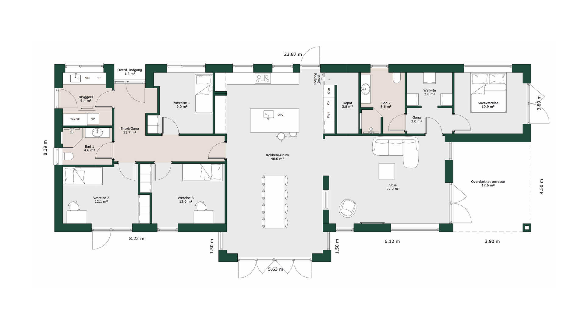 Husets uderum byder på både overdækket terrasse og overdækket indgang.