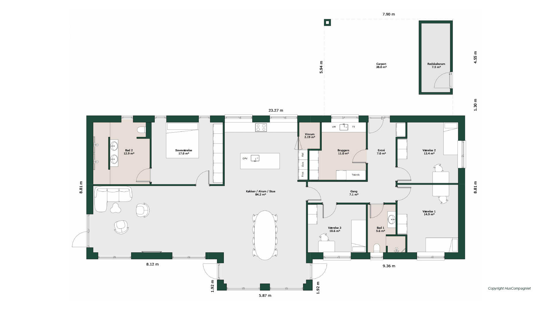 Lækker planløsning med separat børneafdeling med tre gode værelser og et badeværelse. Stort køkken/alrum med lys fra 4 sider giver et dejligt lyst alrum, der ligger i åben forbindelse med stuen så der virkelig er plads til at samles. I forlængelse af køkkenet, er der tilknyttet vinrum. Husets voksenafdeling rummer stort soveværelse med skabsvæg og dejligt badeværelse med dobbeltbrus. Til huset er tilknyttet dobbelt carport med praktisk redskabsrum, så der er plads til både biler og haveredskaber.