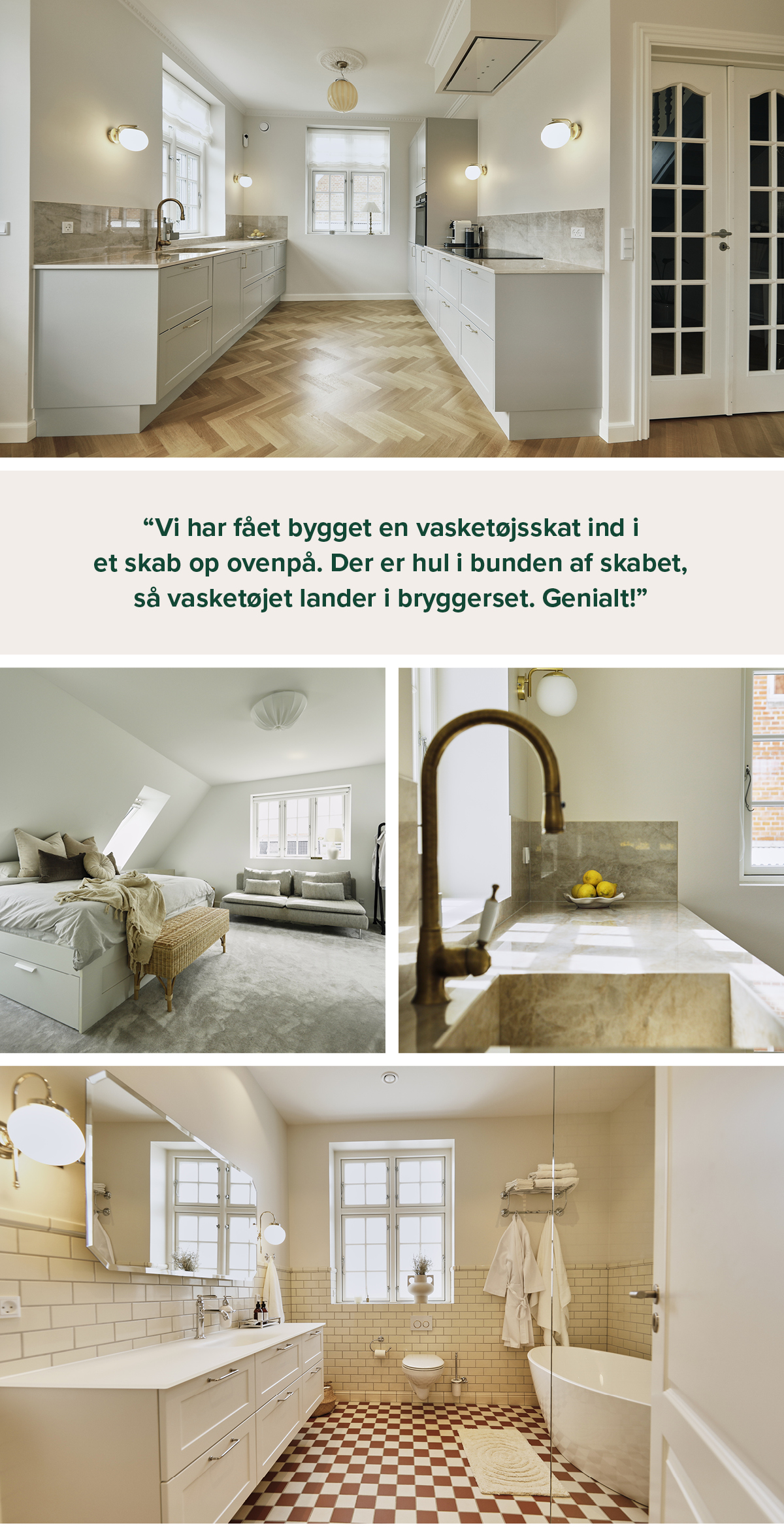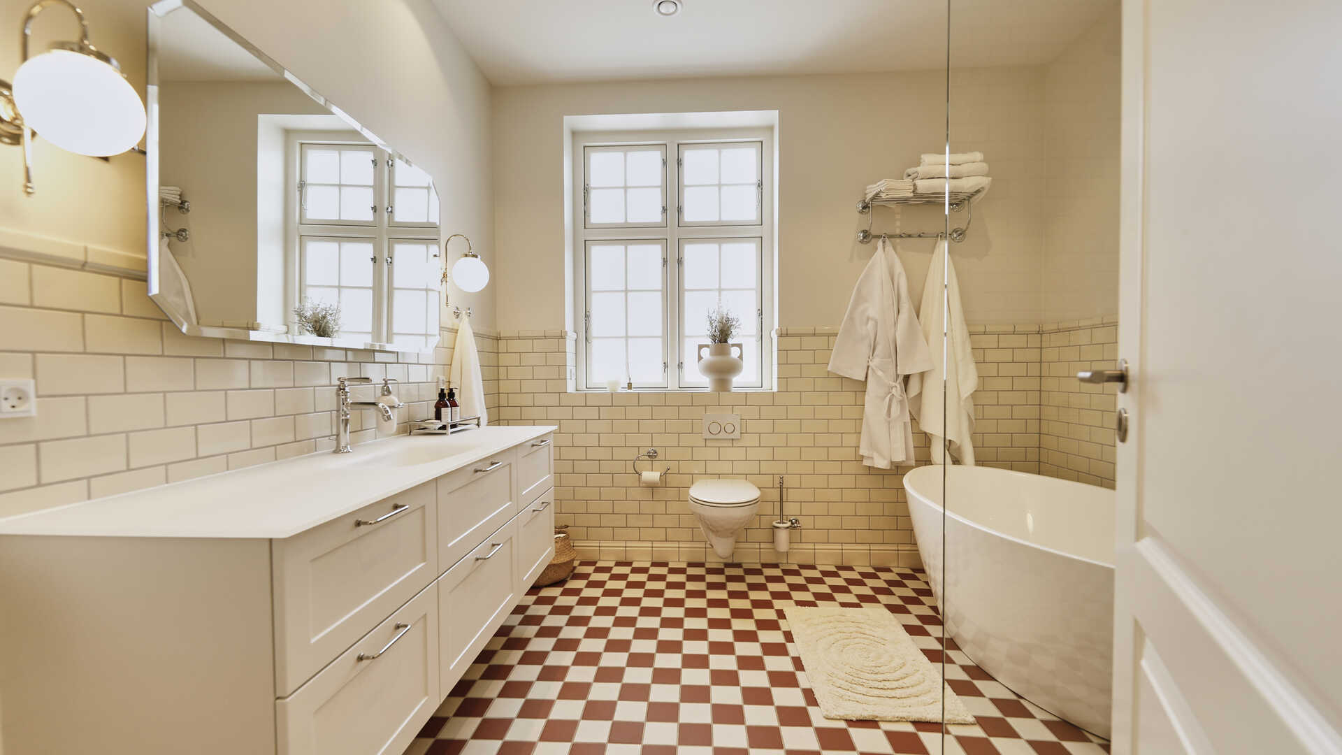 ”Alt fra armaturer, spejle, postkasse og husnummer til farver og fliser er valgt med udgangspunkt i, hvad man gjorde engang,” fortsætter hun.