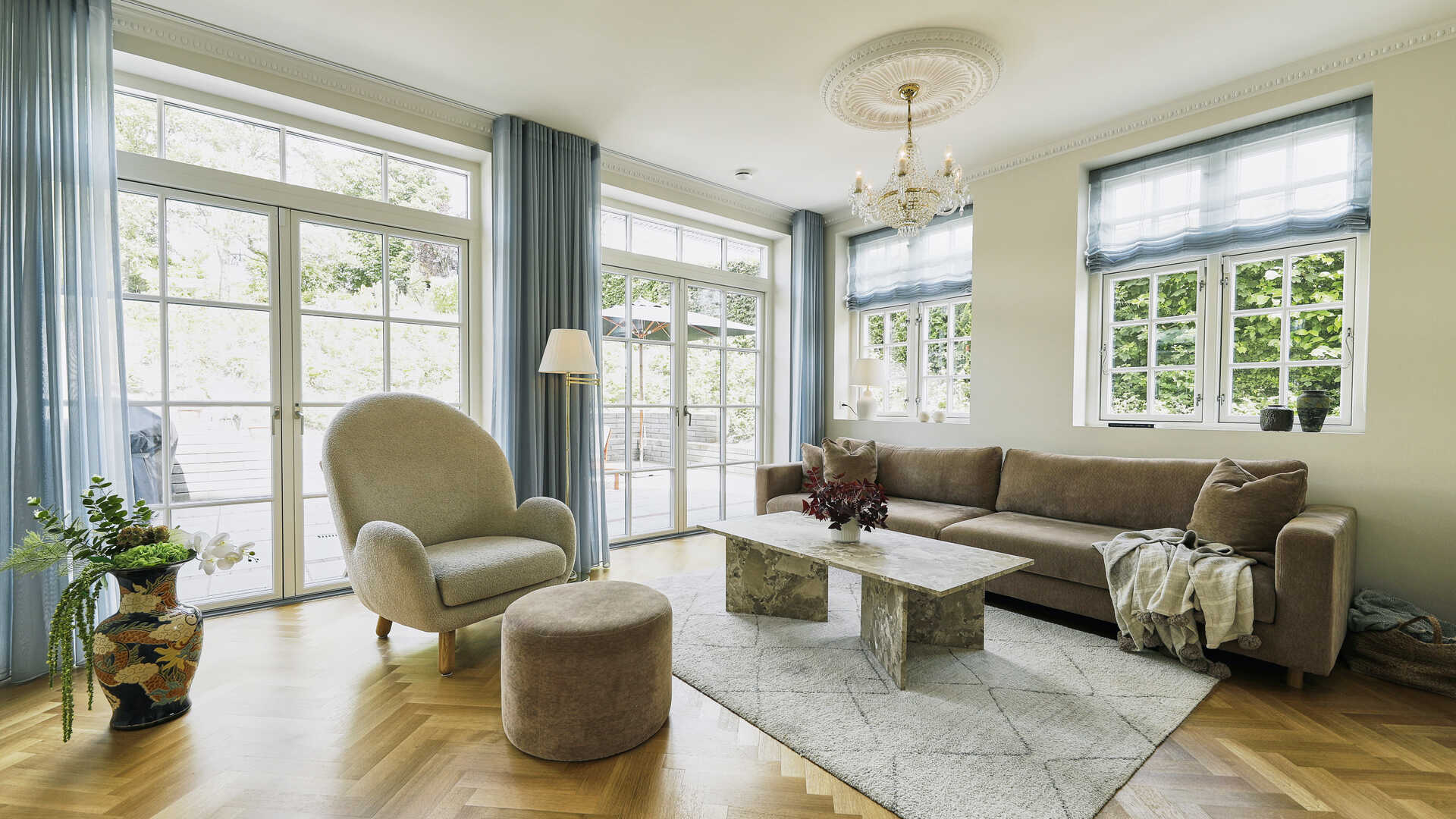 ”Vi gik på jagt efter inspiration i gamle huse og noterede detaljer som gesims, sokkel, stuk og rosetter og tog det med os,” forklarer Carina.