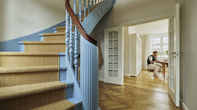Særligt har Carina og Christian ladet sig inspirere af farverne på gamle badehoteller, som også gav inspiration til tæppeløberen i søgræs på den smukke blå og detaljerige trappe.
