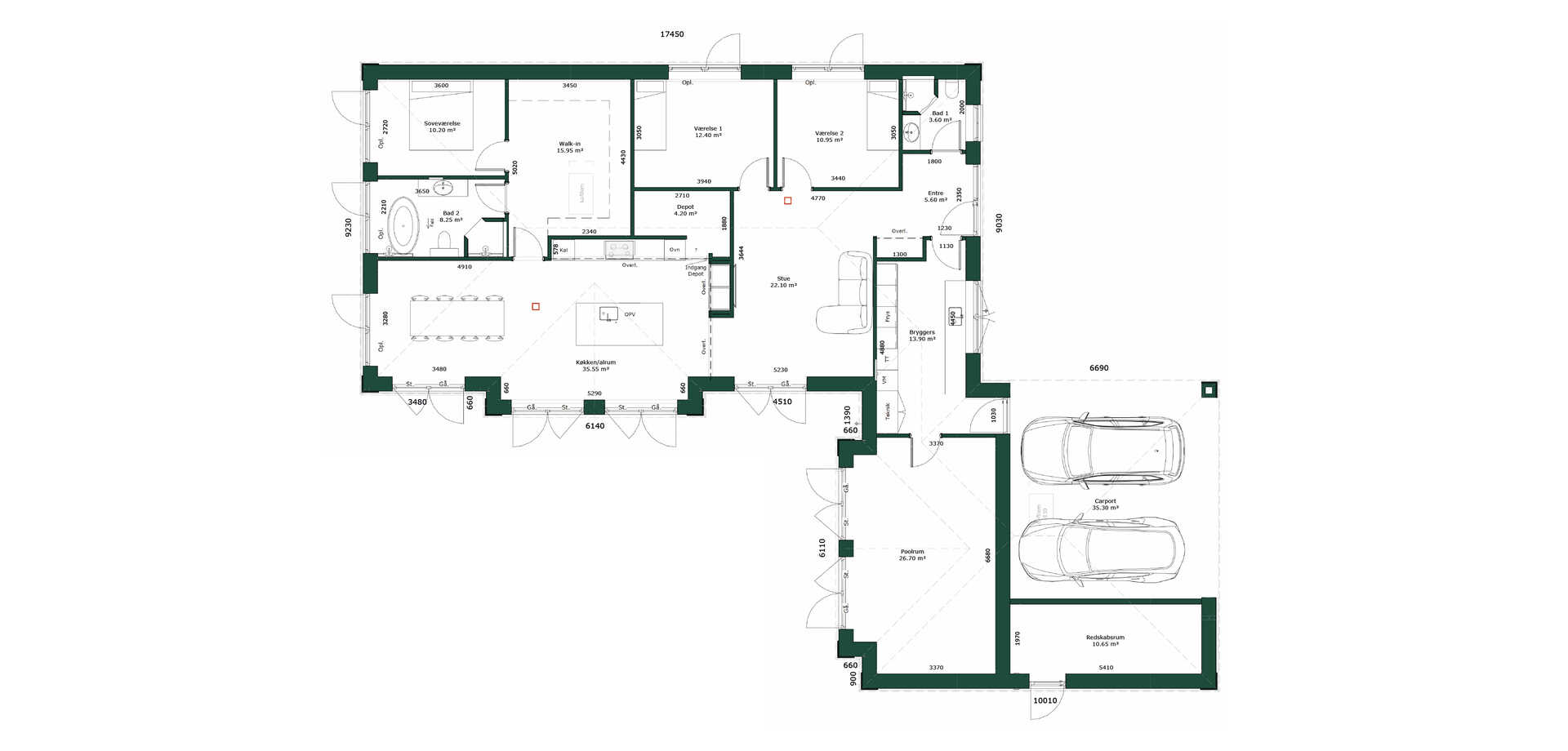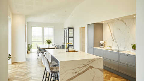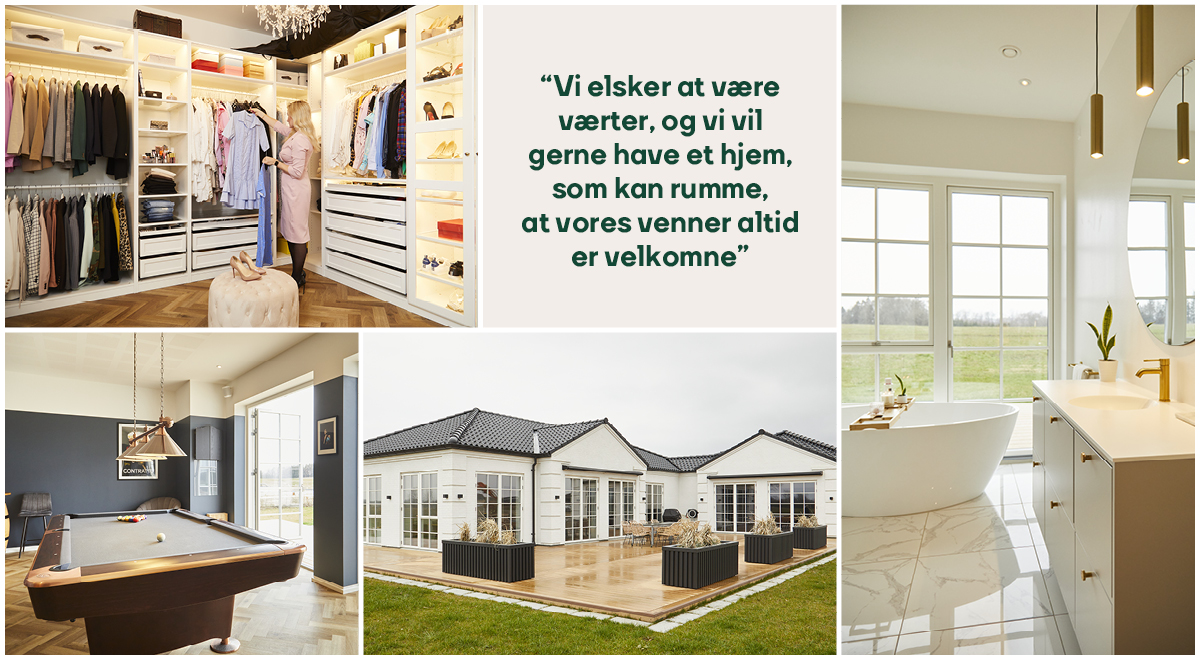 Emilie og Simon har blandt andet prioriteret en stor køkkenø, god plads til et langbord i alrummet, viktualierum, et gæsteværelse, et gæstebadeværelse, øget loftshøjde på 286 cm i hele huset og ikke mindst et stort spillerum til Simons poolbord og Emilies klaver.