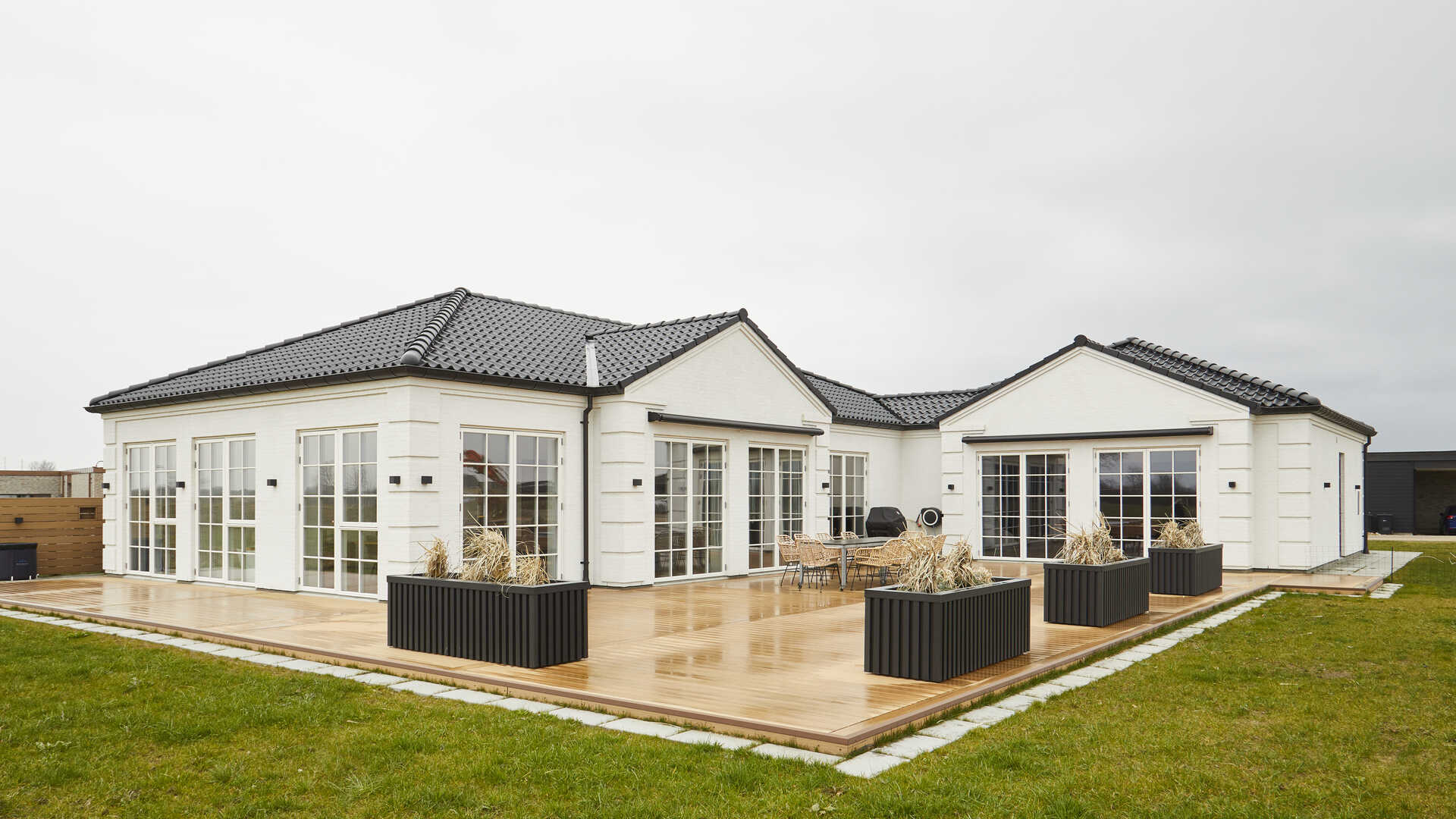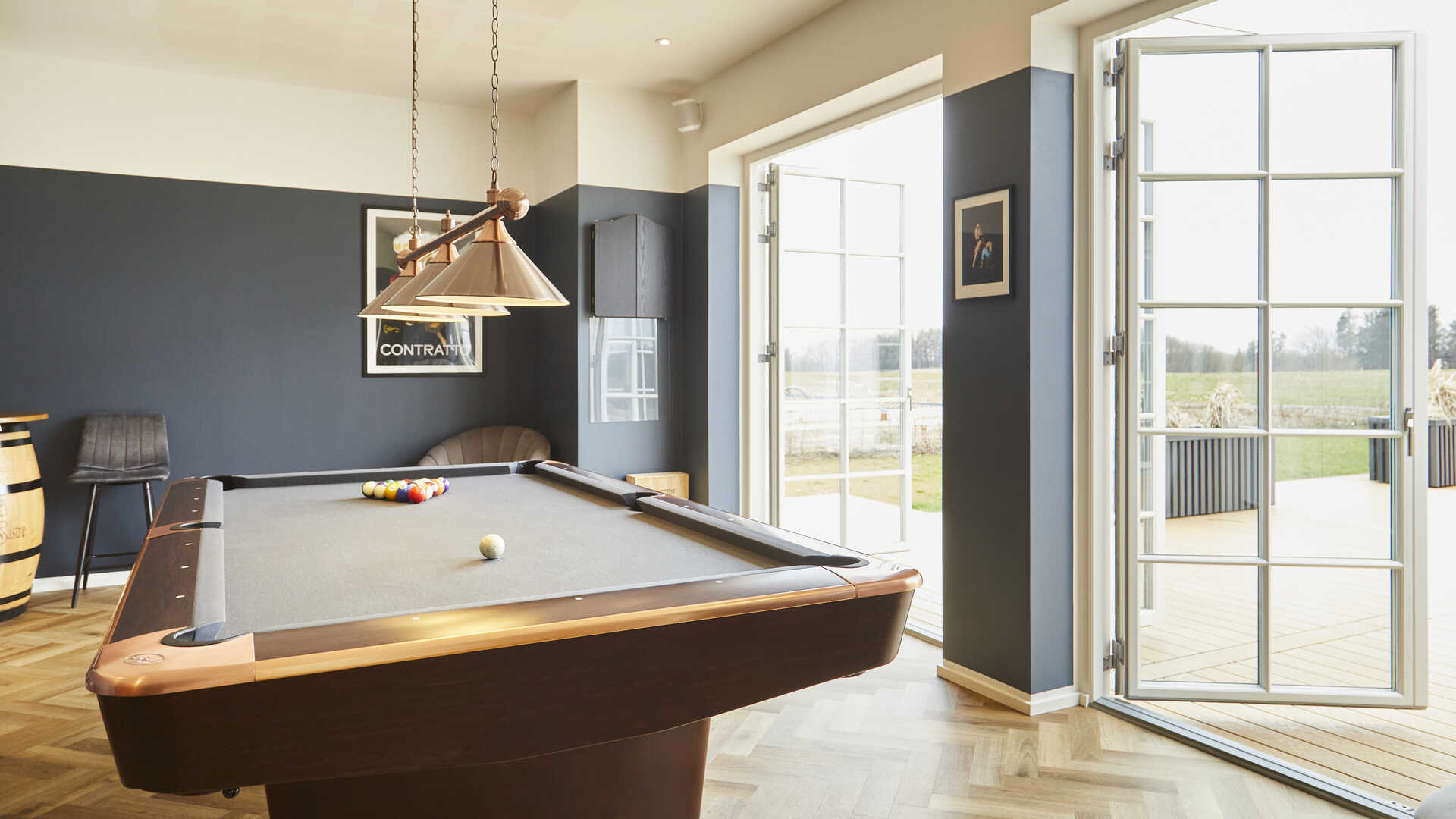 Spillerummet har dobbelte havedøre ud til den store sydvestvendte terrasse, som er bygget præcis på mål efter et festtelt, så parret kan holde fester, hvilket de allerede gjorde tre uger efter indflytning.