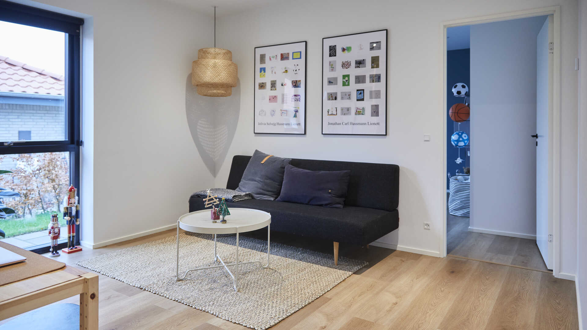 I tegningerne havde Julie og Jacob også lagt vægt på, at deres hus skulle have god plads til børnene og deres venner. Derfor har de indrettet en børneafdeling med to børneværelser og et multirum imellem de to værelser, hvor der er plads til både kreaværksted og gaming.