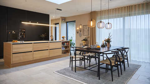 Noget af det vigtigste for parret i planløsningen var et stort, funktionelt køkken/alrum i husets hjerte. Parret elsker at samle venner og familie, og Jacob har madlavning som en af sine største hobbyer - så meget at han vandt Masterchef på TV3 i 2019 og igen i 2022 i Masterchef Jul.