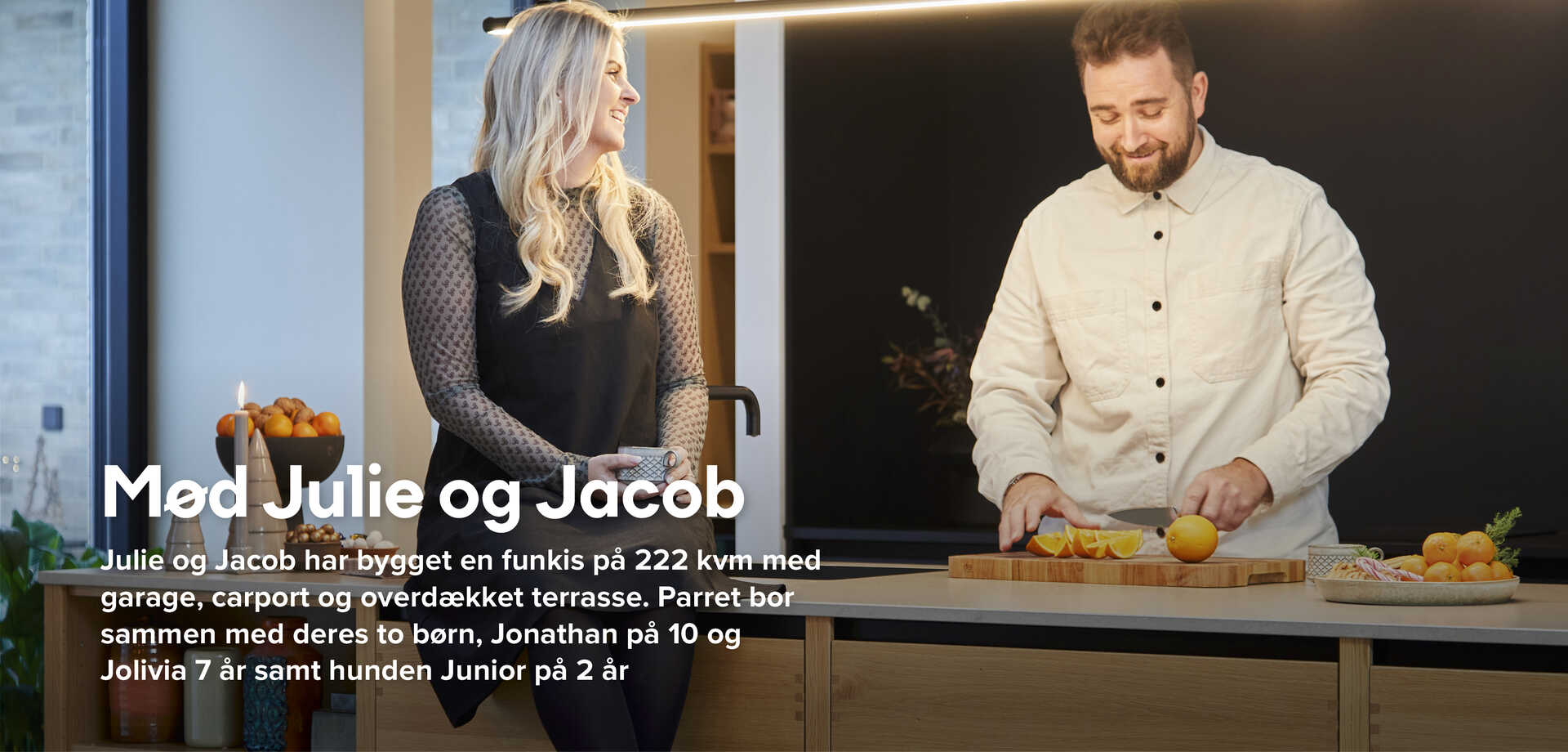 En højt beliggende, skrånende grund med naboer til kun den ene side, et grønt areal til den anden side, et lille skovstykke langs baghaven og ikke mindst den helt rigtige placering i forhold til solen. Det var i Julie og Jacobs øjne den optimale grund at bygge deres drømmehus på – til dem selv og deres to børn.