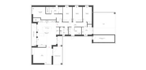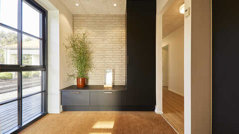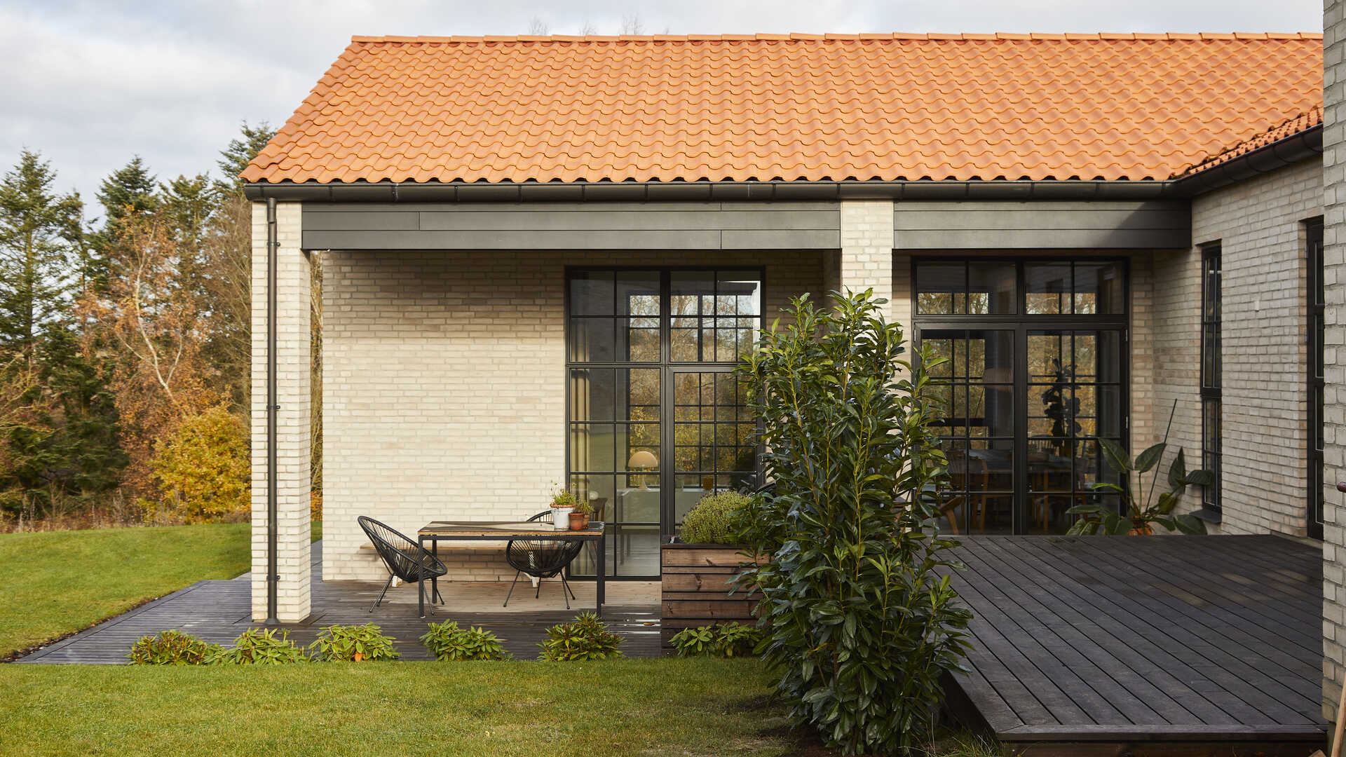 Familiens hus er et moderne parcelhus uden udhæng, men arkitekturen har fået flere twists, som tilfører et klassisk udtryk. F.eks. har de store vinduespartier fået sprosser, og taget er røde tegl.