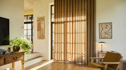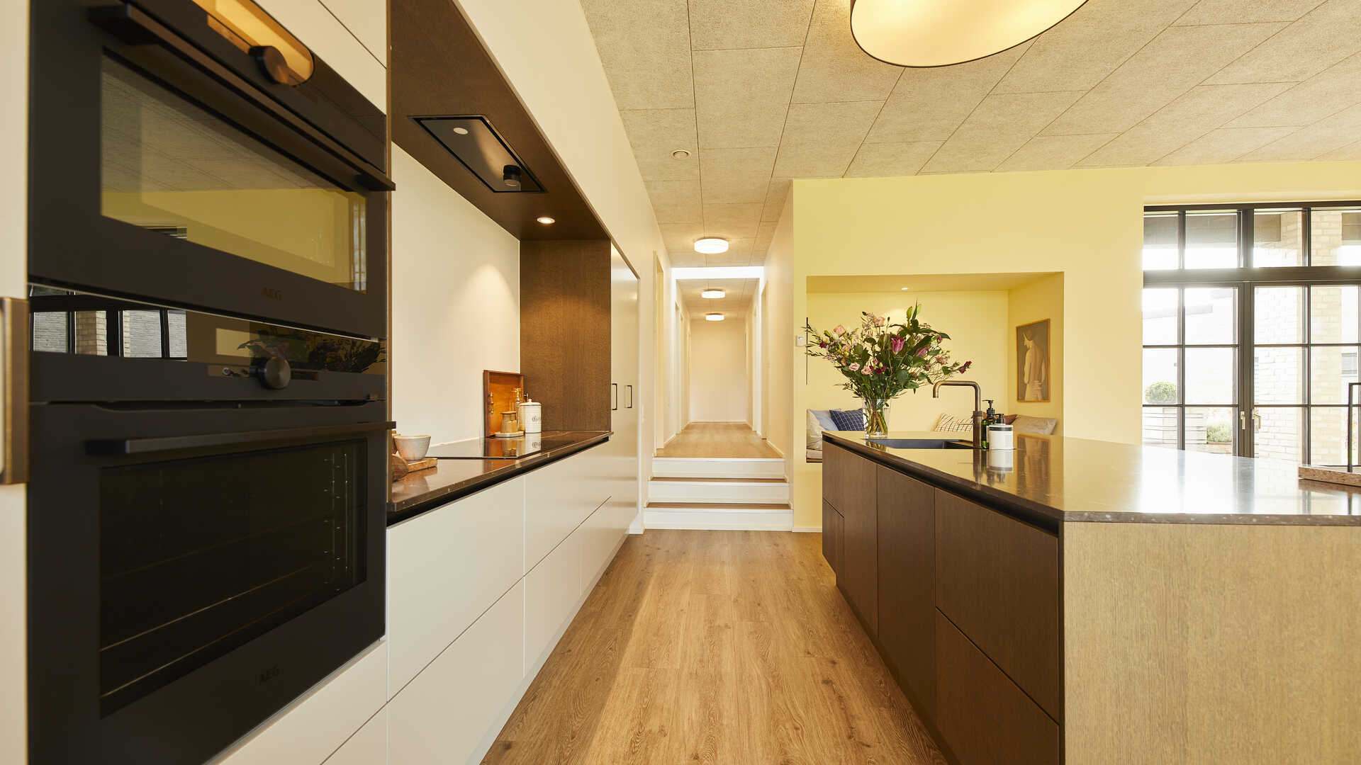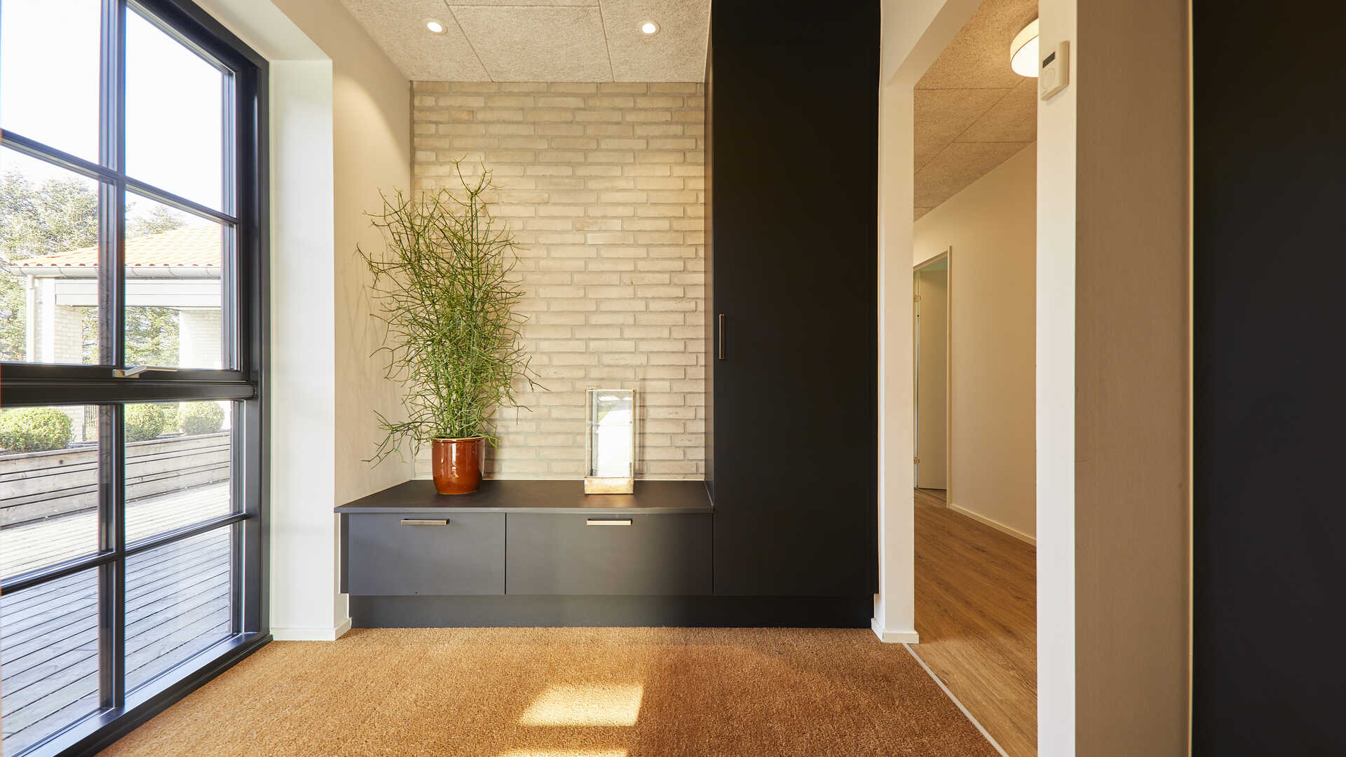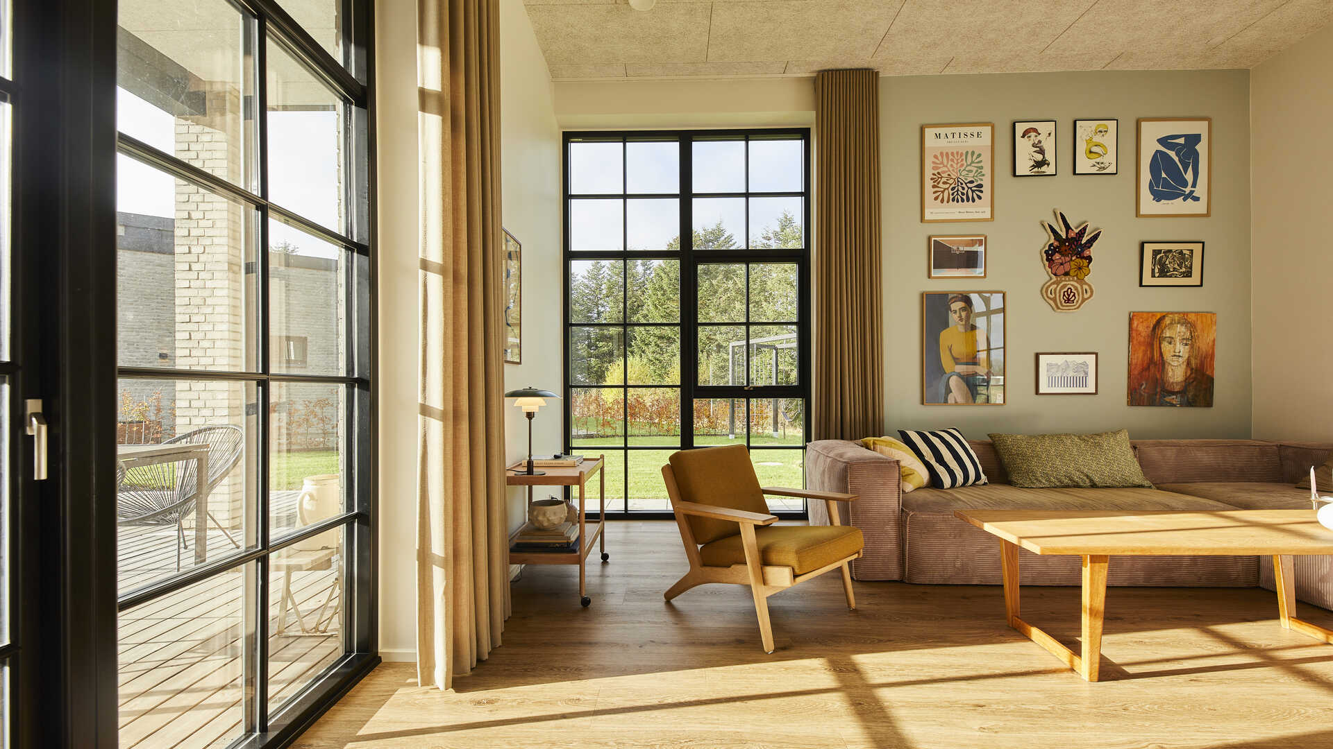 Indendørs er der også kælet for detaljerne i materialevalget for at skabe et personligt, varmt og hyggeligt hjem. Fra mikset mellem træ, mursten og klinker i varme toner til lange gardiner, farver på væggene og sorte vinduer indvendigt.