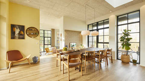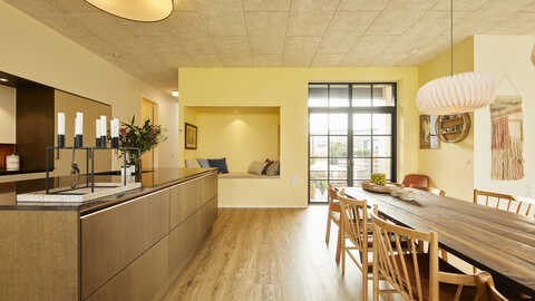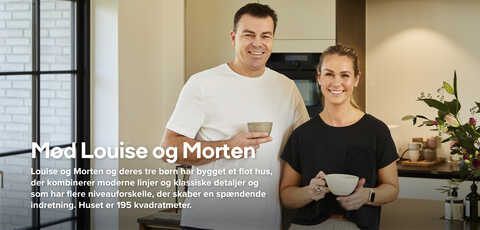 ”Det sjove er, at man ude fra vejen slet ikke kan se, hvad husets indretning kan. Det åbner sig virkelig op, når man kommer ind,” fortæller Louise, der sammen med sin mand Morten og deres tre børn har fået bygget et hus på 195 kvadratmeter med to nedsænkninger, der giver 304 cm til loftet i køkken-alrummet og hele 344 cm til loftet i stuen.