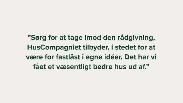 "Vi er enormt positive over for HusCompagniet, fordi de formåede både at rådgive og udfordre os. Arkitekten havde f.eks. tænkt haven og terrassen på en anden måde, end vi selv havde, og det sætter vi stor pris på i dag, fordi det har givet os merværdi i dagligdagen," siger Flemming og fortsætter: