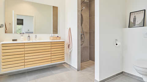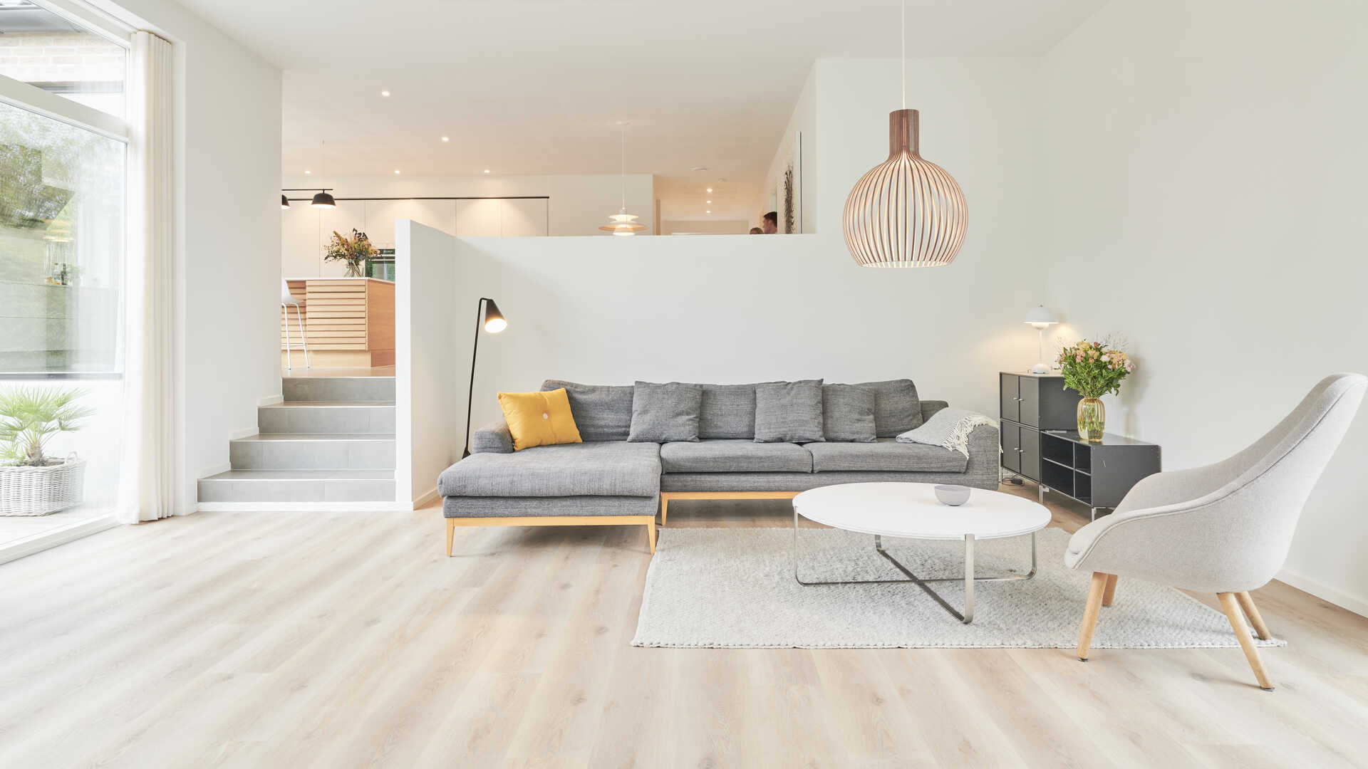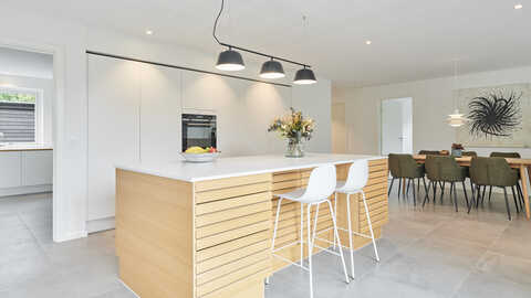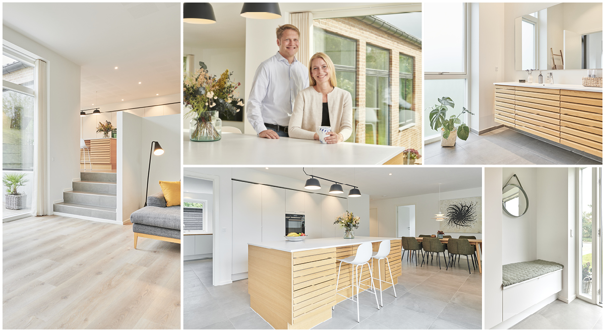”Vi er virkelig glade for den måde, niveauforskellen er blevet løst. Vi var igennem forskellige muligheder med HusCompagniets arkitekt, som lyttede til, hvad vi kunne tænke os, og resultatet virker naturligt og fungerer i praksis,” fortæller Tina, som også selv brugte meget tid på både at tænke og tegne skitser, inden den endelige plan blev lagt.