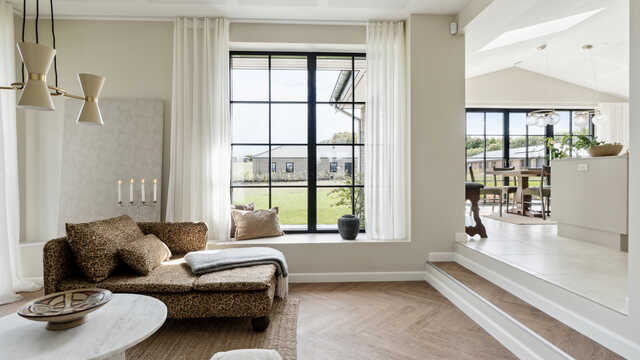 Det er næsten altid en god idé med en havedør i stuen, så I kan nyde sommervejret og haven om sommeren. Her er havedøre og vinduer til gulv sammen om at skabe lys og udsigt.