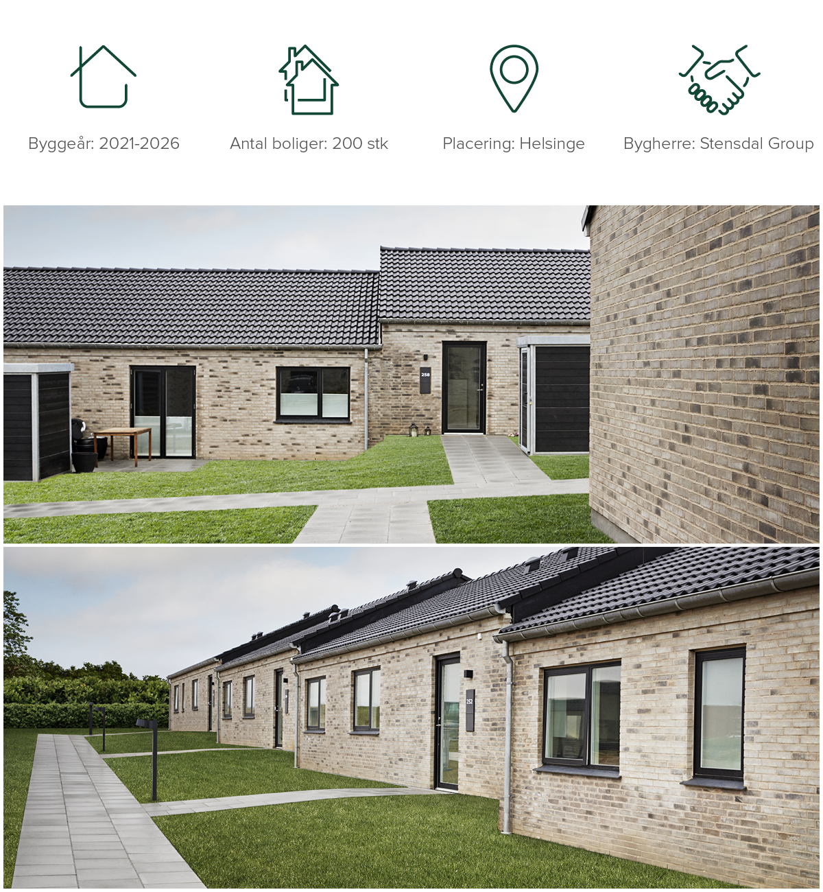 I et nyt boligkvarter i den sydlige del af Helsinge har vi for Stensdal Group opført 200 boliger til udlejning. Boligerne er på 80-110 m2 og opført i tidløs og vedligeholdelsesfri arkitektur uden udhæng, og med luft-til-vand varmepumper.