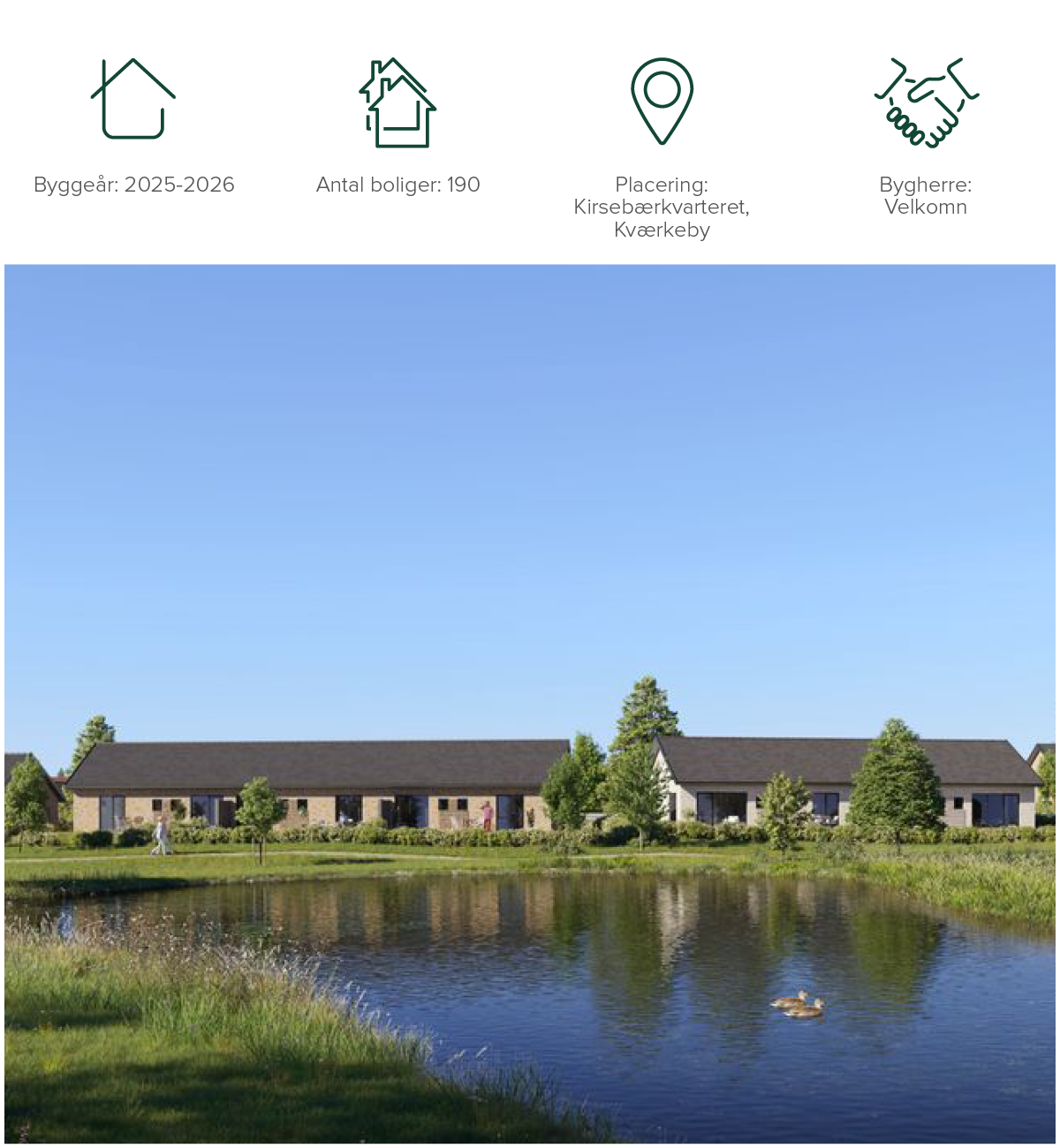 HusCompagniet opfører 190 boliger i endnu et samarbejde med Velkomn i Ringsted. Området kaldes for Kirsebærkvarteret og de 190 nye boliger omfatter både rækkehuse, dobbelthuse, gårdhavehuse samt mindre parcelhuse. Alle boliger bliver DGNB-Guld-certificerede, ligesom man fokuserer på at opnå en bedre livscyklusvurdering ved blandt andet at anvende træ i byggeriet.